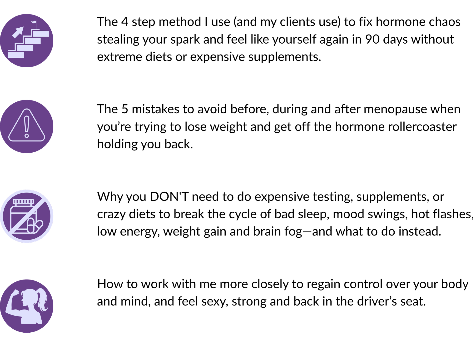 Come learn how to feel like yourself again, get out of perimenopause & menopause hormone chaos, and lose weight (in just 90 days) without extreme diets or unnecessary supplements.